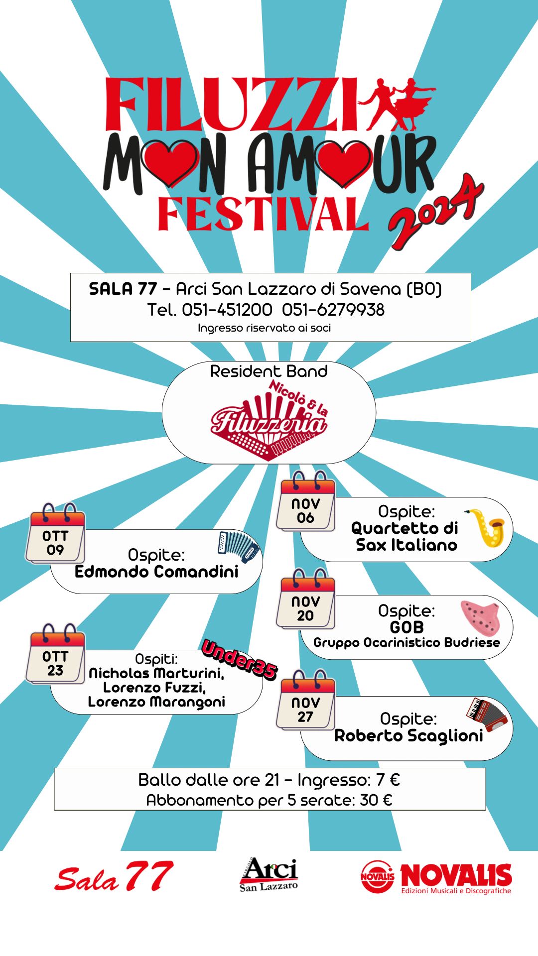 Durante le serate del festival, che si svolgeranno nelle date del 9 e 23 ottobre e del 6, 20 e 27 novembre 2024, la resident band “Nicolò e al Filuzzeria” accompagnerà gli ospiti con la loro inconfondibile energia e passione, mantenendo viva l’eredità musicale di questa antica tradizione. Ogni appuntamento sarà arricchito dalla partecipazione di ospiti d’eccezione, a cominciare dal virtuoso della fisarmonica Edmondo Comandini, passando per il raffinato Quartetto di Sax Italiano, fino a giovani talenti emergenti della scena Filuzziana: i fisarmonicisti Nicholas Marturini, Lorenzo Fuzzi e Lorenzo Marangoni, tutti under 35. Tra gli altri protagonisti, il celebre GOB (Gruppo Ocarinistico Budriese) e Roberto Scaglioni, che contribuiranno a rendere il festival un’esperienza indimenticabile. Il Filuzzi Mon Amour Festival è un’occasione unica per immergersi nelle atmosfere senza tempo delle balere bolognesi, dove musica, danza e tradizione si fondono in un grande abbraccio intergenerazionale.